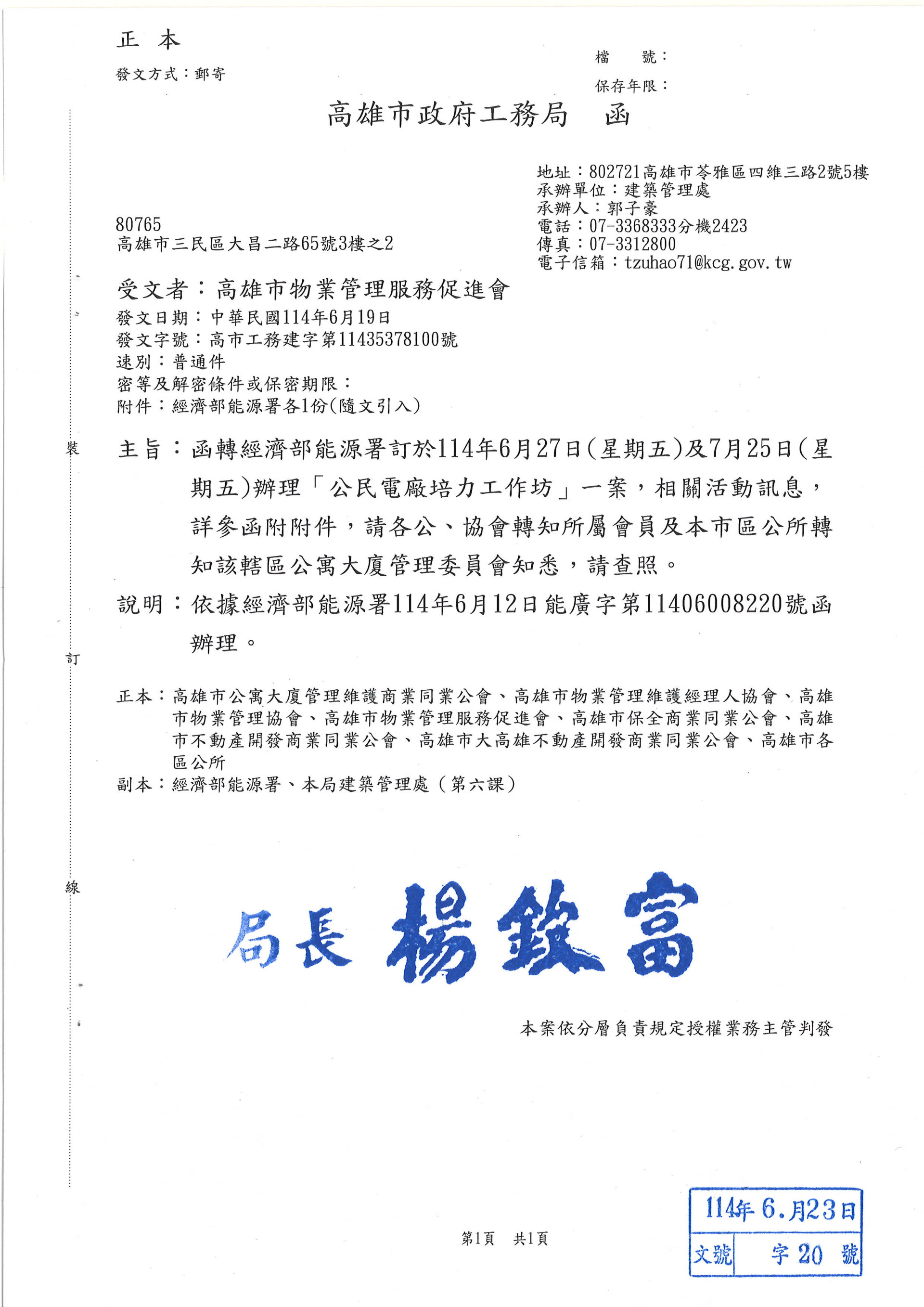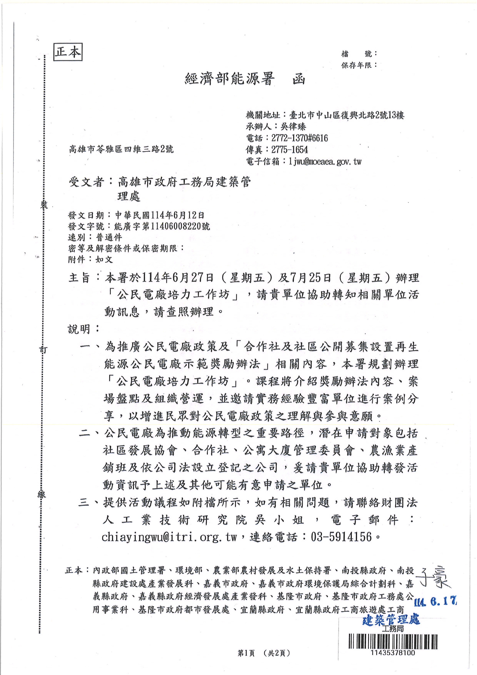 函轉經濟部能源署訂於114年6月27日及7月25日辦理[公民電廠培力工作坊]