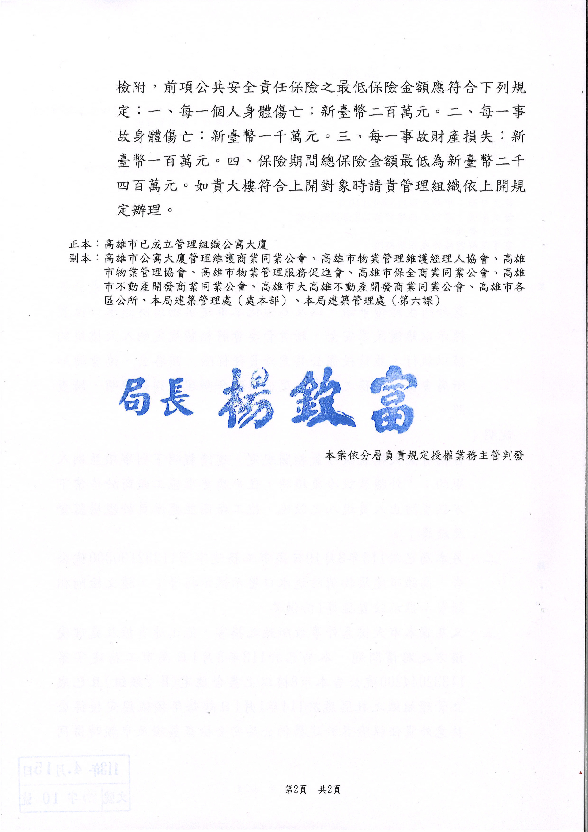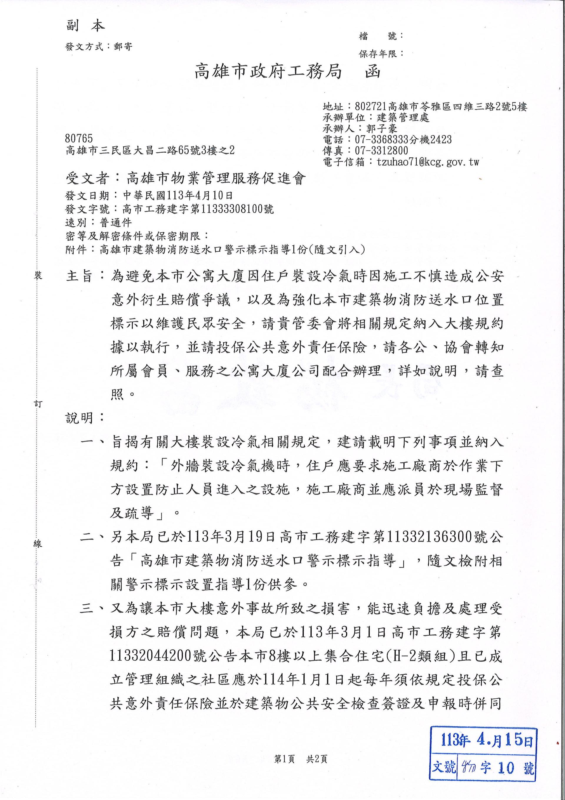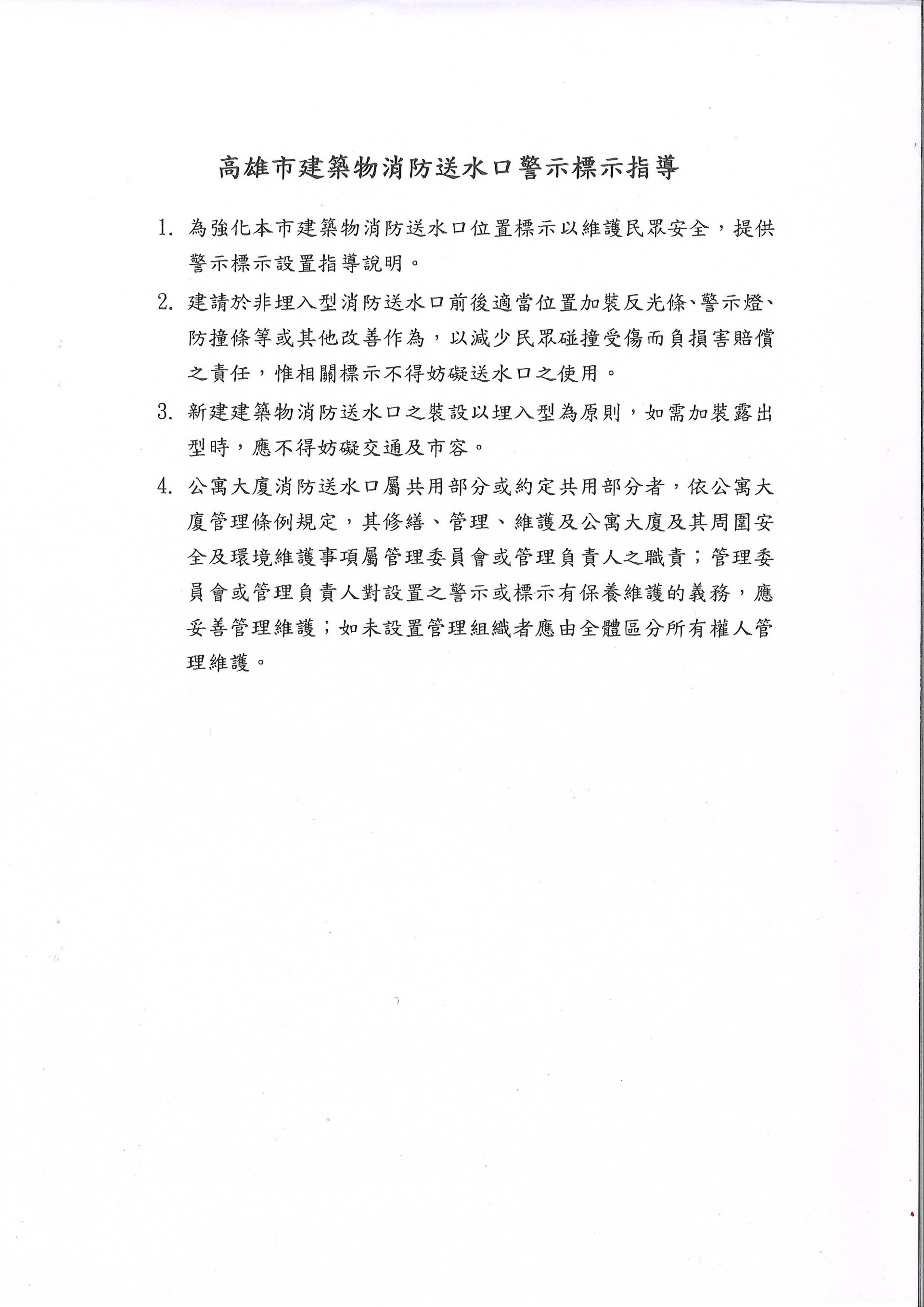 為避免公寓大廈因住戶裝設冷氣時因施工不慎造成公安意外衍生賠償爭議,以及為強化本市建築物消防送水口位置標示以維護民眾安全,請貴管委會將相關規定納入大樓規約據以執行,並請投保公共意外責任保險