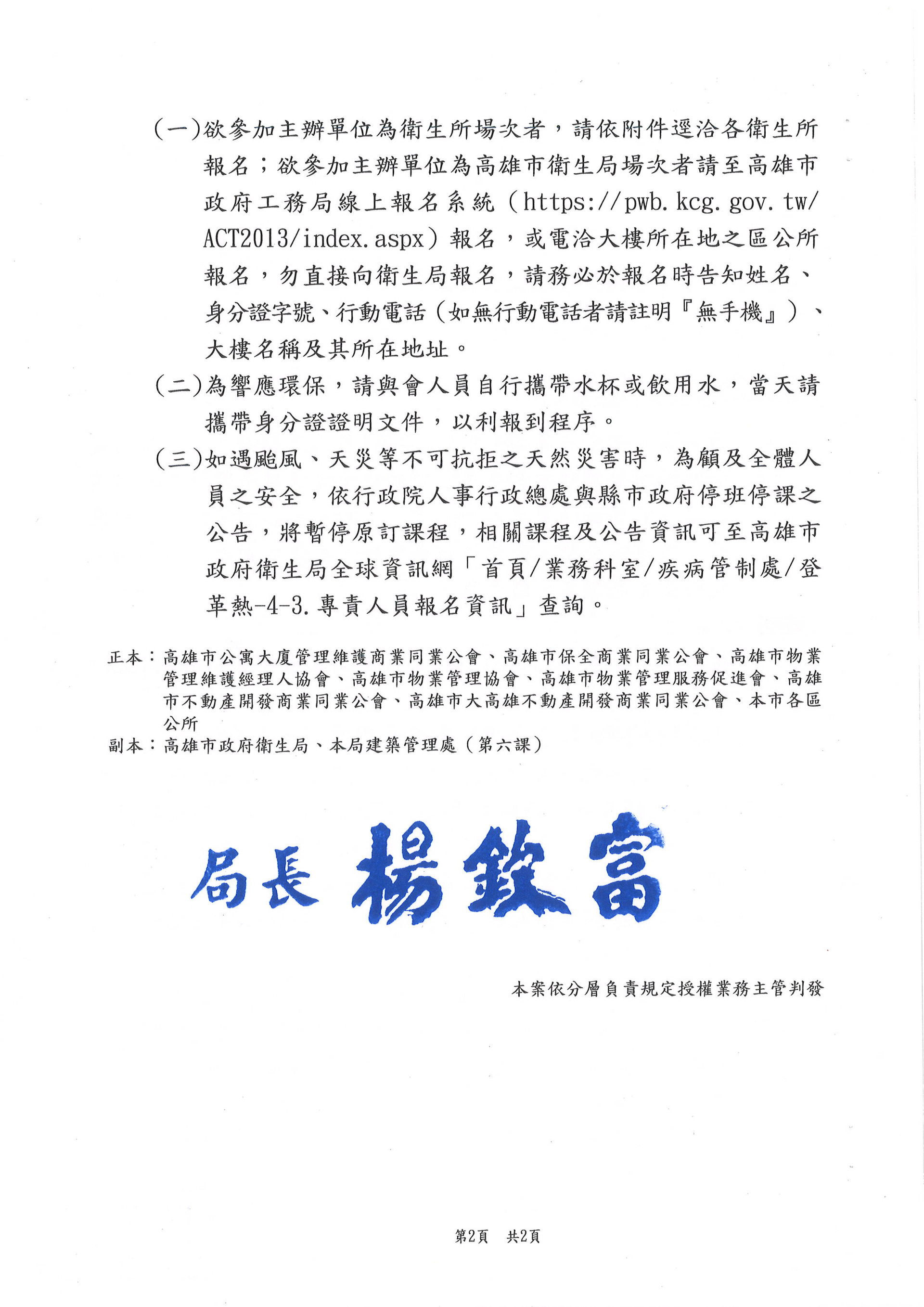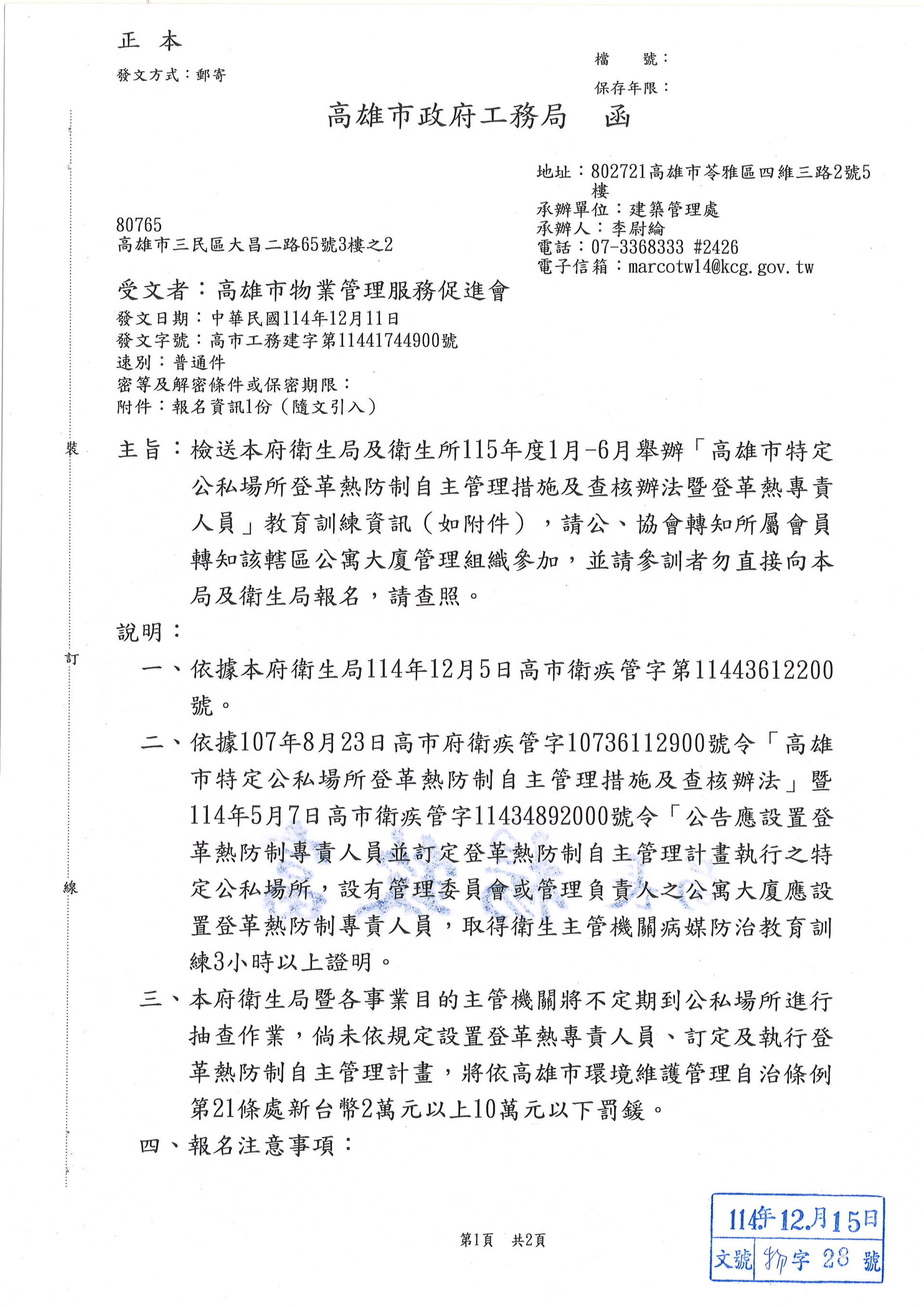 檢送衛生局與衛生所115年度1-6月舉辦[高雄市特定公私場所登革熱防制自主管理措施及查核辦法暨登革熱專責人員]教育訓練資訊