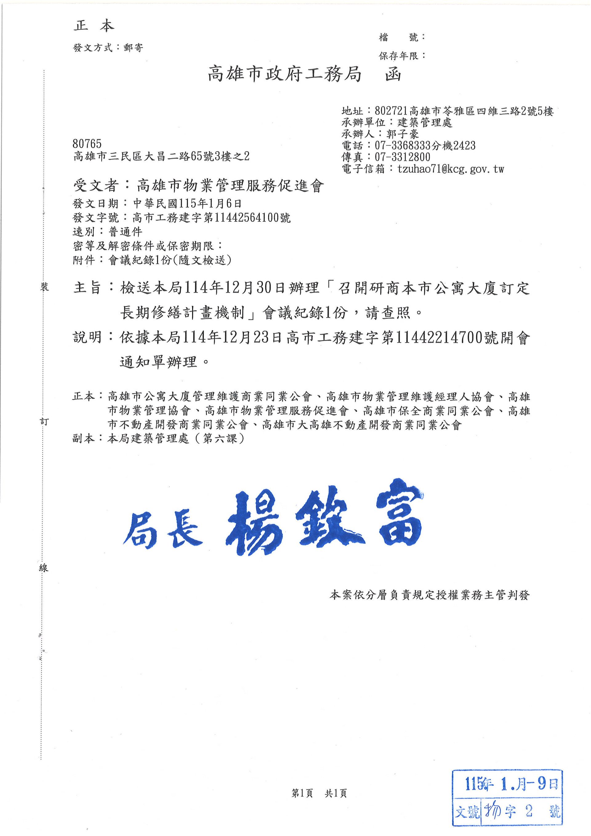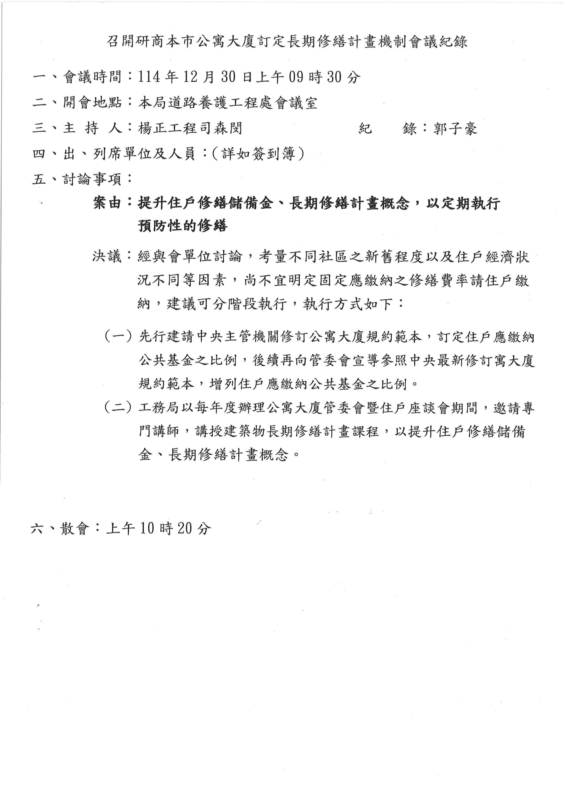 檢送本局114年12月30日辦理[召開研商本市公寓大廈訂定長修繕計畫機制]會議紀錄一份