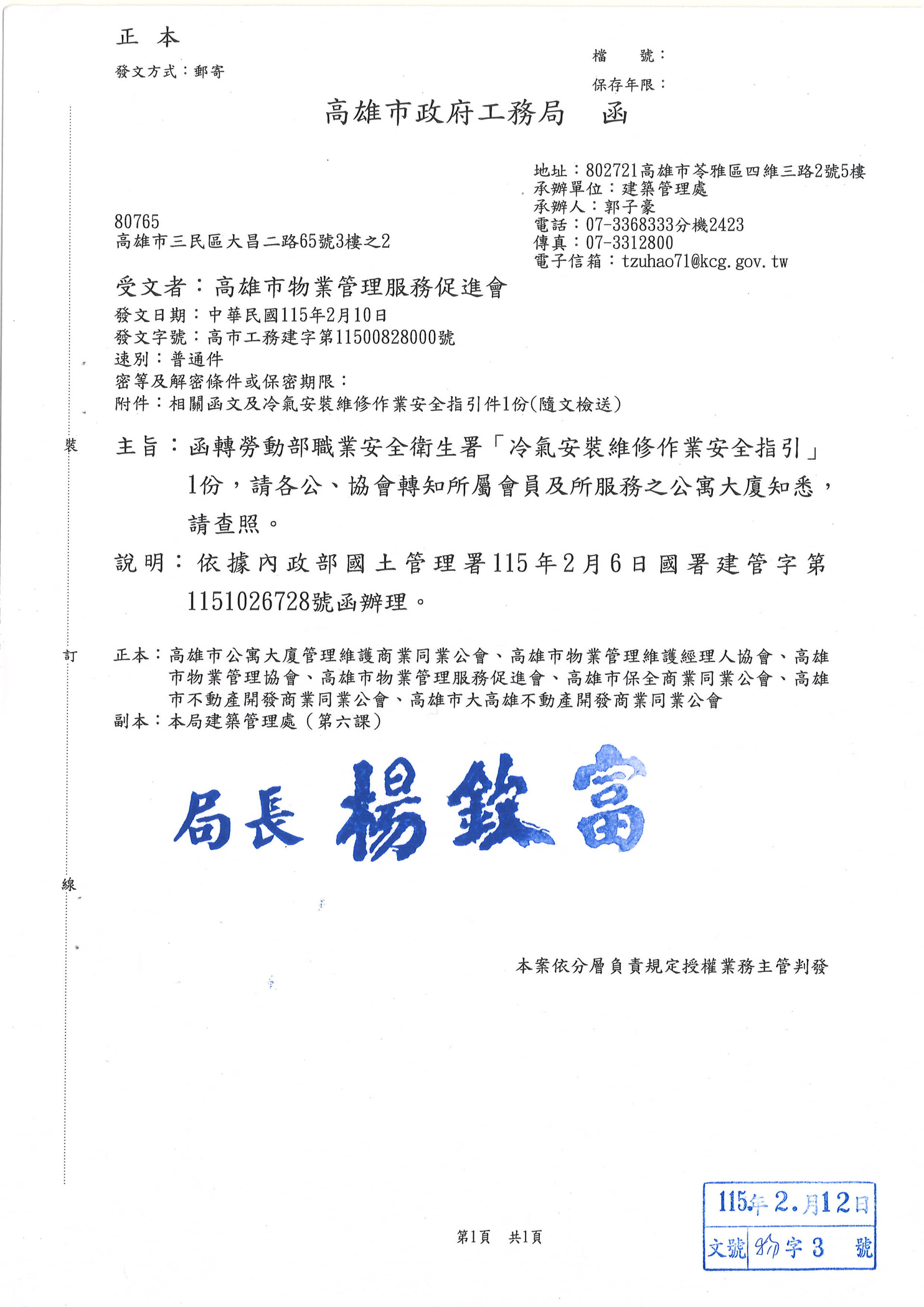 函轉勞動部職業安全衛生署[冷氣安裝維修作業安全指引]