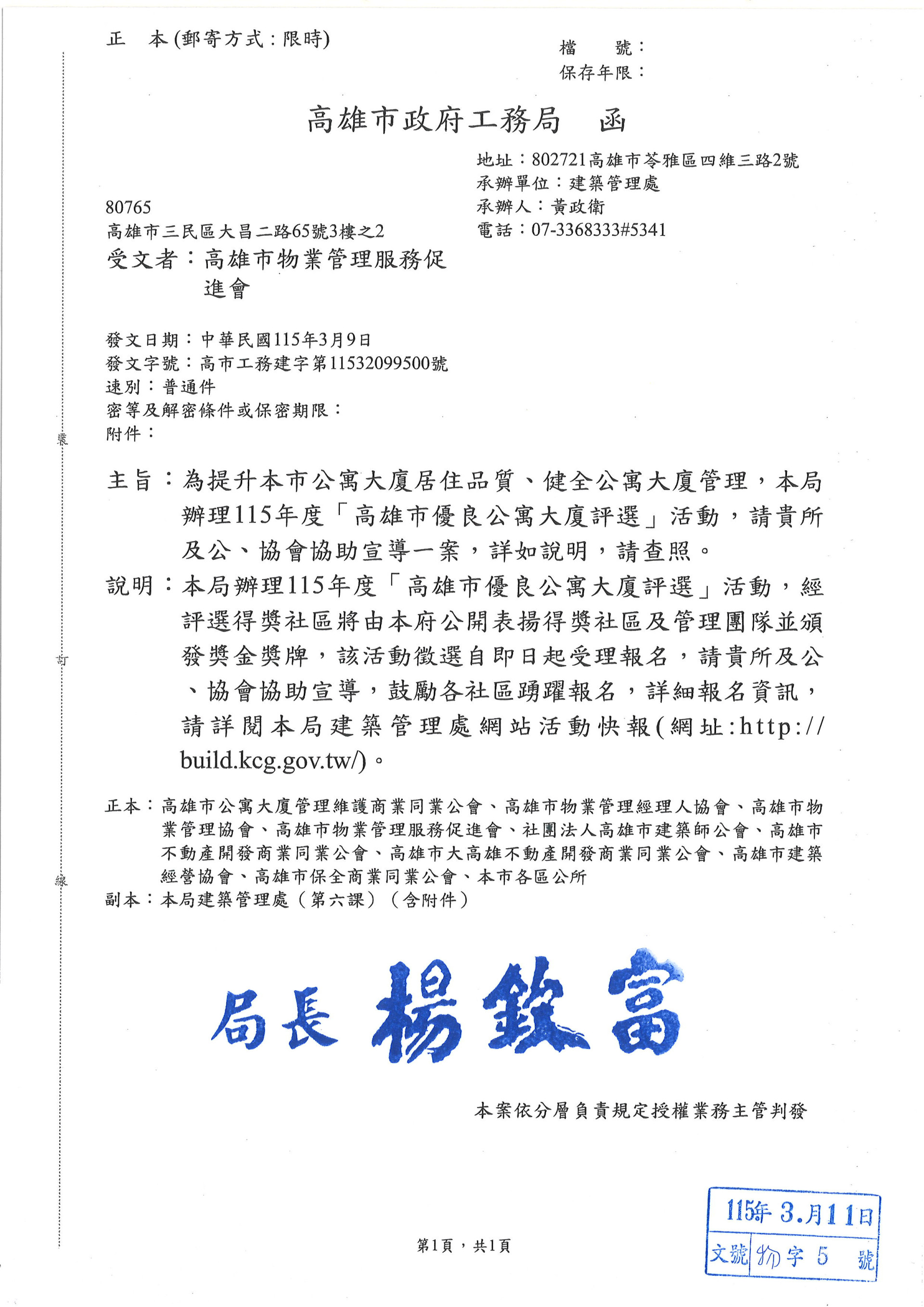 辦理115年度[高雄市優良公寓大廈評選]活動