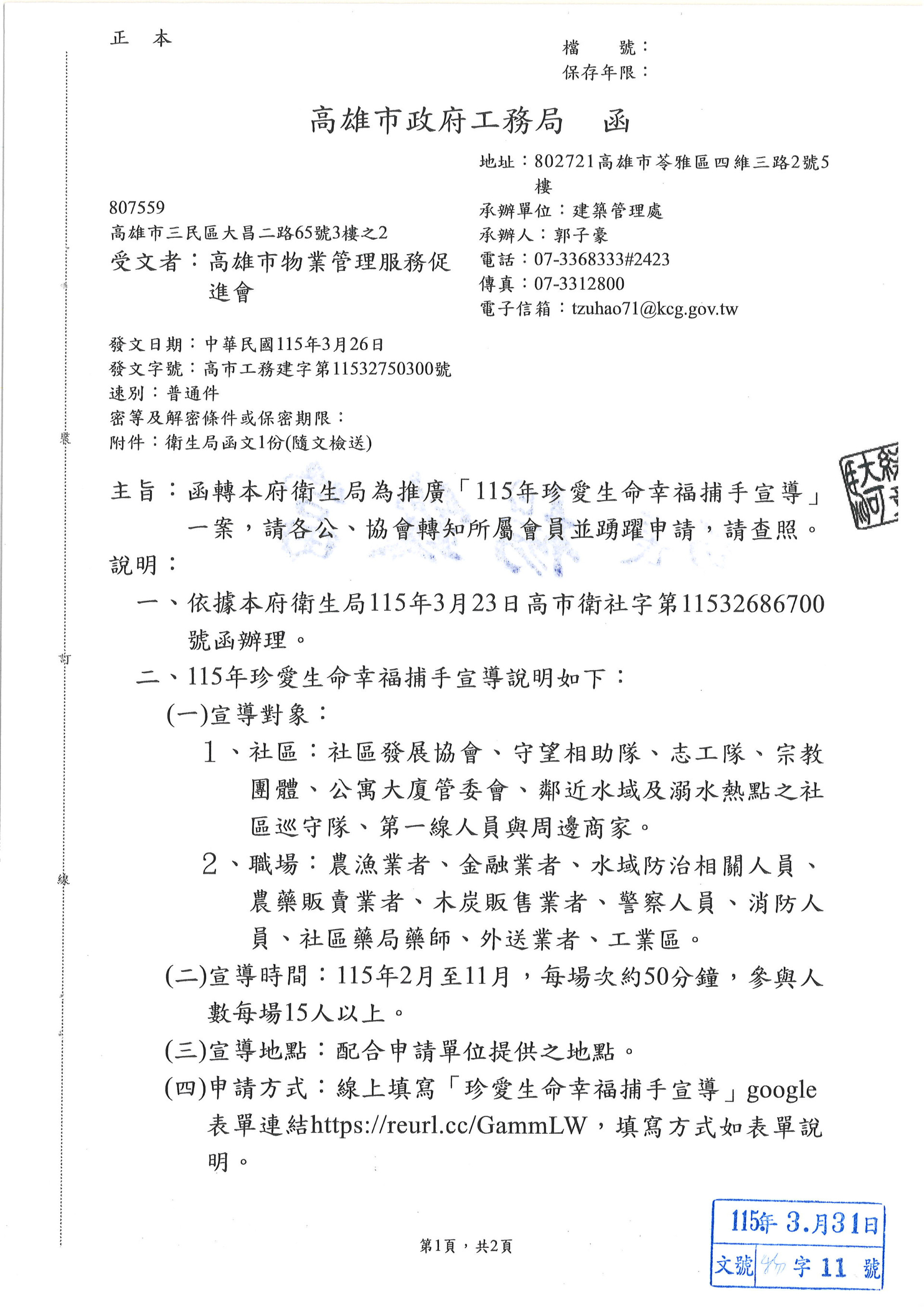 衛生局為推廣[115年珍愛生命幸福補手宣導]