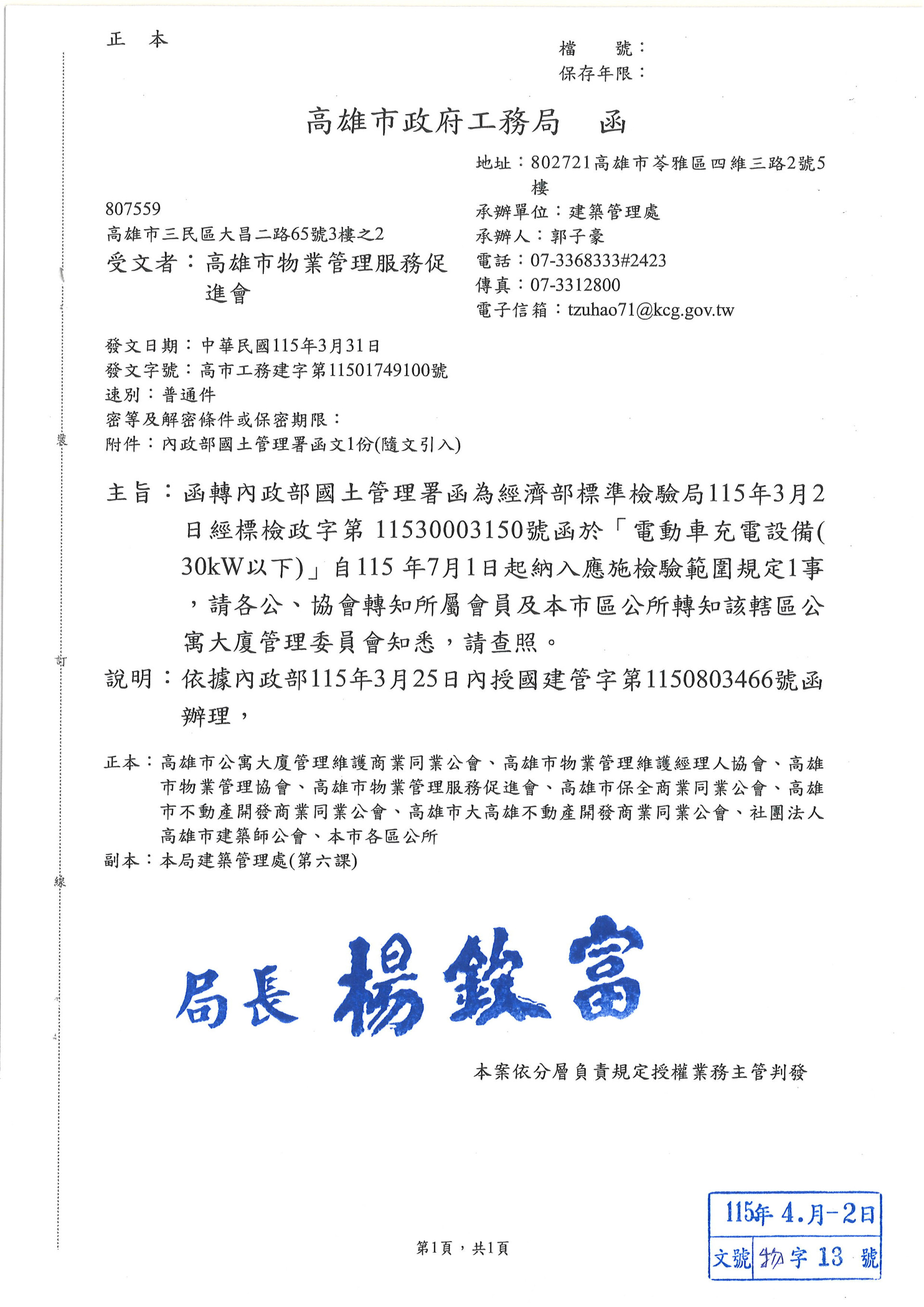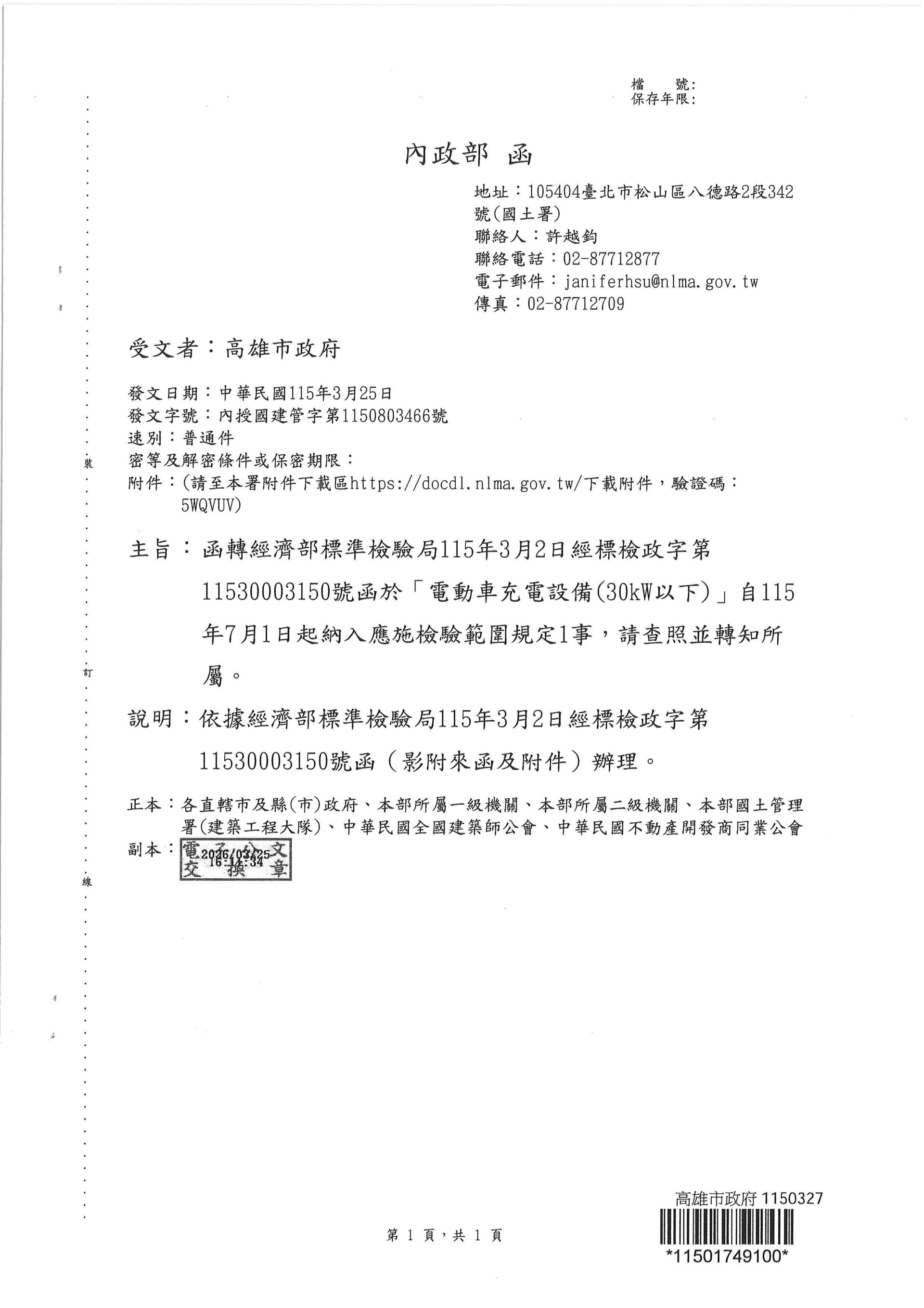 內政部國土管理署函為經濟部標準檢驗局115年3月2日經標檢政字第11530003150號函於[電動車充電設備(30kW以下)]自115年7月1日起納入應施檢驗範圍規定