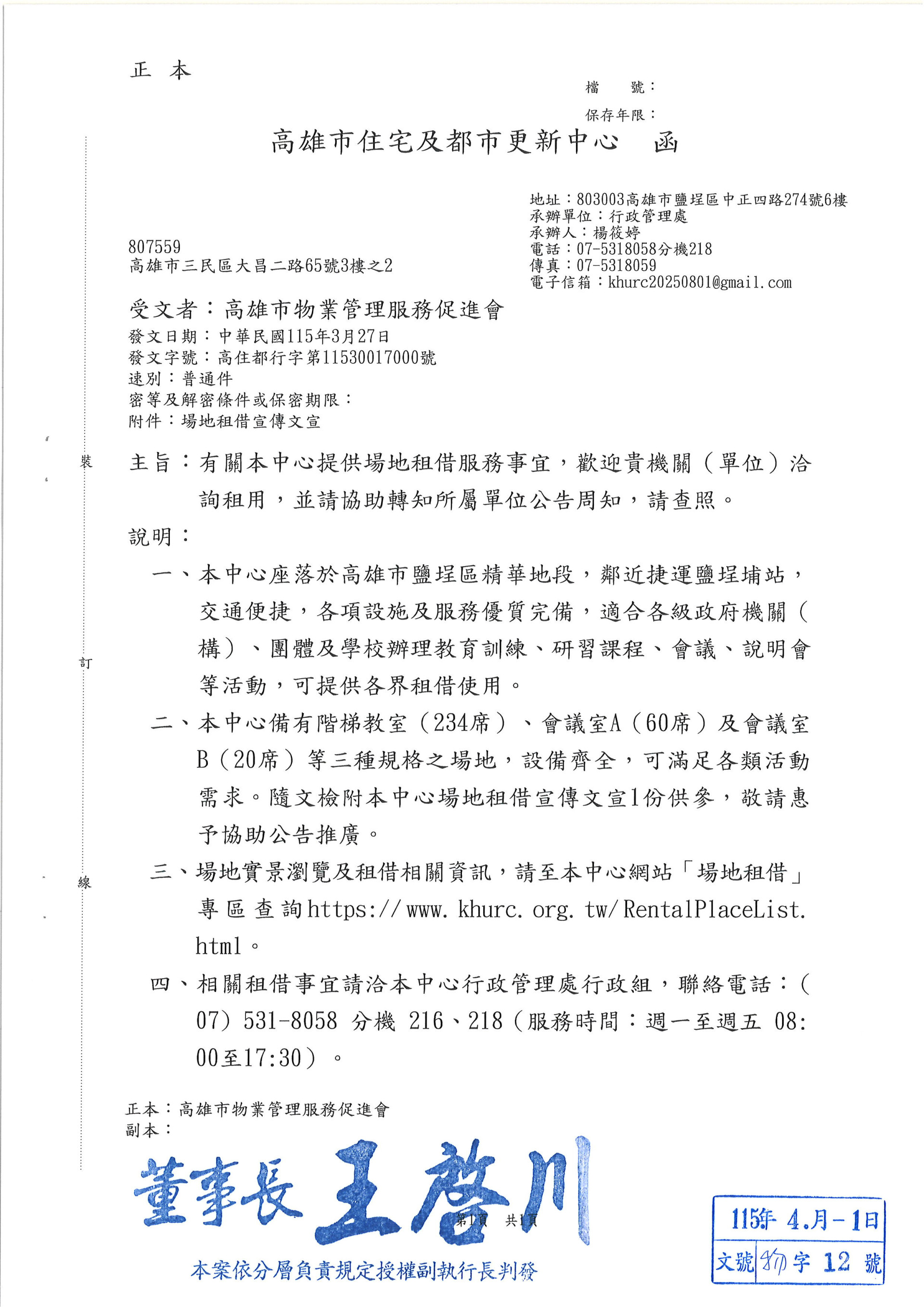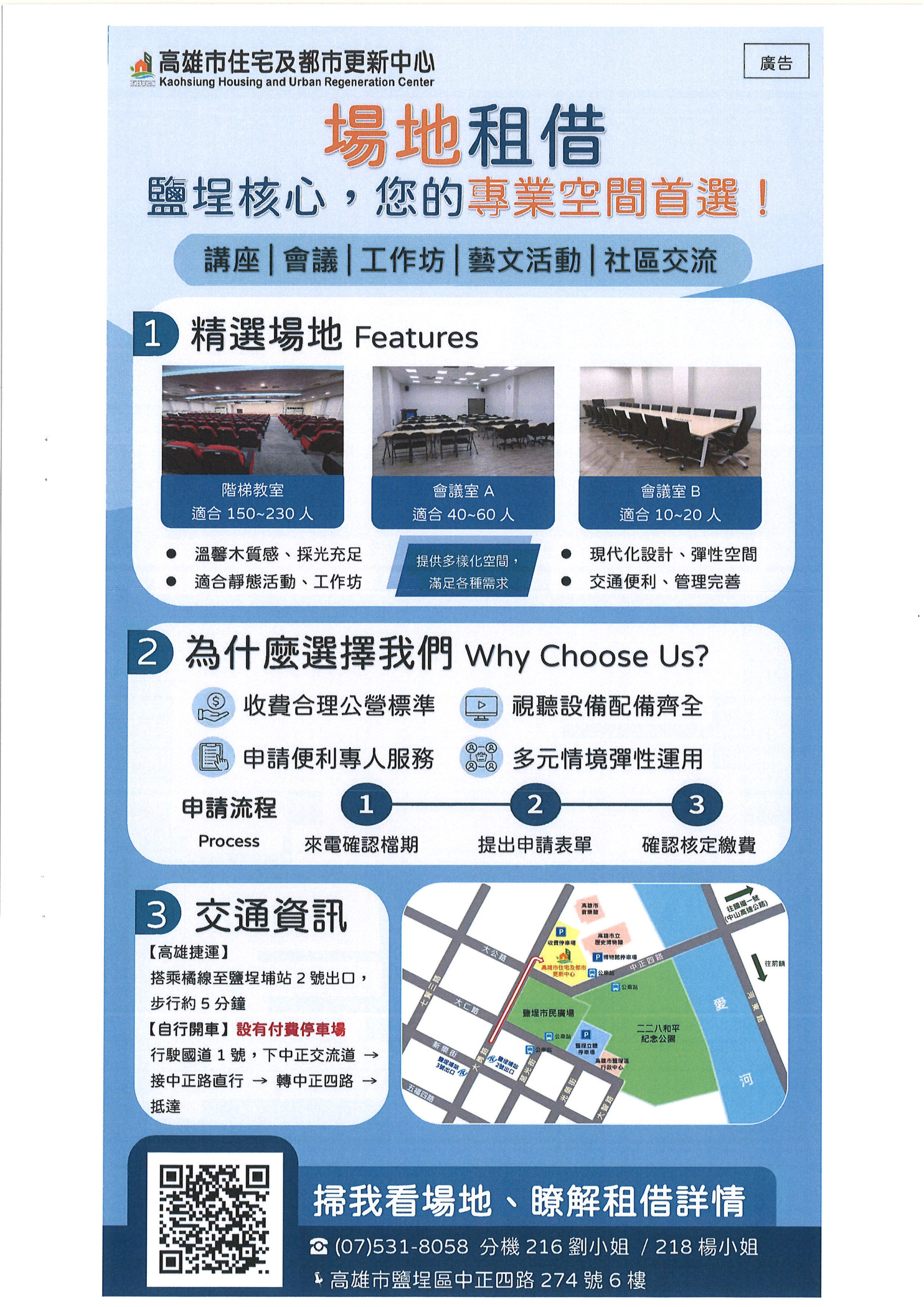 有關本中心提供場地租借服務事宜,歡迎貴機關(單位)洽詢租用